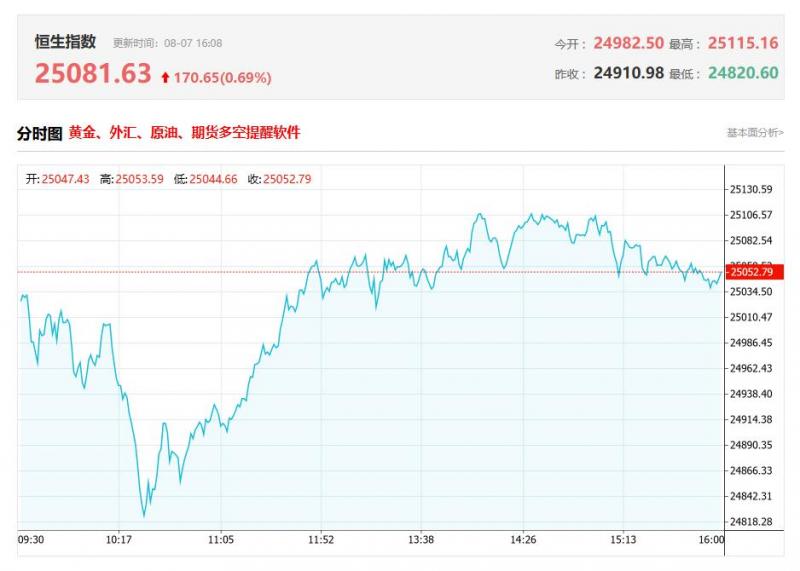 港股收盘行情: 香港恒生指数8月7日(周四)收盘上涨171.0点,涨幅0.69%,报25081.63点; 香港恒生科技指数8月7日(周四)收盘上涨14.56点,涨幅0.26%,报5546.73点; 国企指数8月7日(周四)收盘上涨49.05点,涨幅0.55%,报8981.73点; 红筹指数8月7日(周四)收盘上涨47.3点,涨幅1.12%,