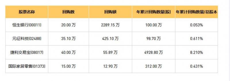 08月08日港股回购概况: 捷利交易宝(08017)、国际家居零售(01373)、恒生银行(00011)、元征科技(02488)于2025年8月7日进行了回购。其中,回购金额最大的为恒生银行(00011),回购数量20.00万,回购金额2289.15万元。 (亚汇网编辑:书瑶)