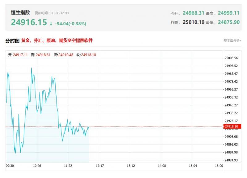 上午盘面: 港股上午盘三大指数集体走低,恒生科技指数一度跌至1.3%,午间收跌0.99%,恒生指数、国企指数分别下跌0.66%及0.61%,恒指再度失守25000点关口。盘面上,大型科技股集体表现低迷但总体跌幅不大,其中,阿里巴巴跌1.7%,百度、腾讯跌超1%,小米、京东、美团跌幅在0.7%以内;半导体芯片股走低,权重中