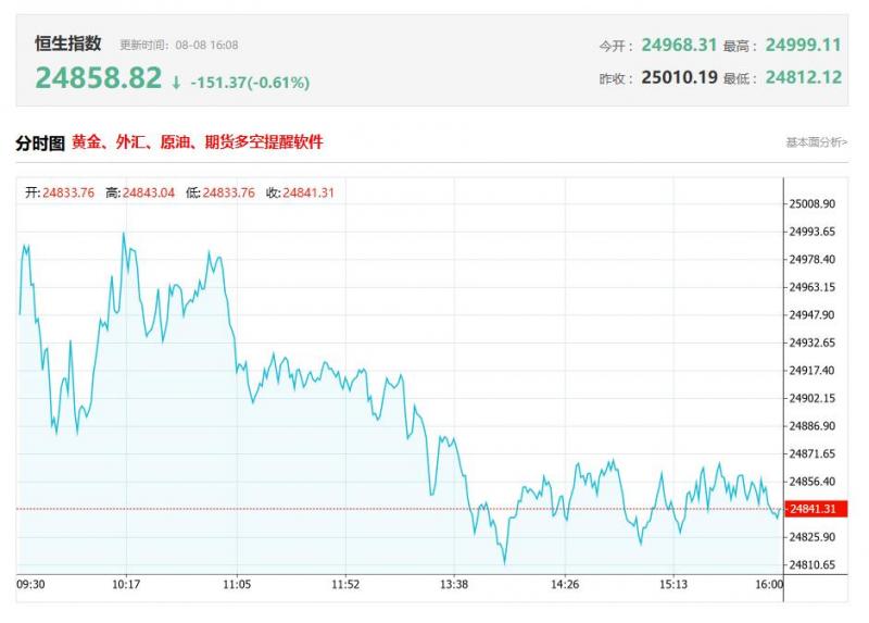 港股收盘行情: 香港恒生指数8月8日(周五)收盘下跌222.81点,跌幅0.89%,报24858.82点; 香港恒生科技指数8月8日(周五)收盘下跌86.43点,跌幅1.56%,报5460.3点; 国企指数8月8日(周五)收盘下跌86.45点,跌幅0.96%,报8895.28点; 红筹指数8月8日(周五)收盘上涨13.54点,涨幅0.32%
