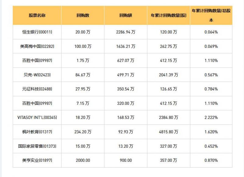 08月11日港股回购概况: VITAOYINT'L(00345)、国际家居零售(01373)、恒生银行(00011)、元征科技(02488)、美亨实业(01897)、美高梅中国(02282)、枫叶教育(01317)、百胜中国(09987)、百胜中国(09987)、贝壳-W(02423)于2025年8月8日进行了回购。其中,回购金额最大的为恒生银行(00011),回购