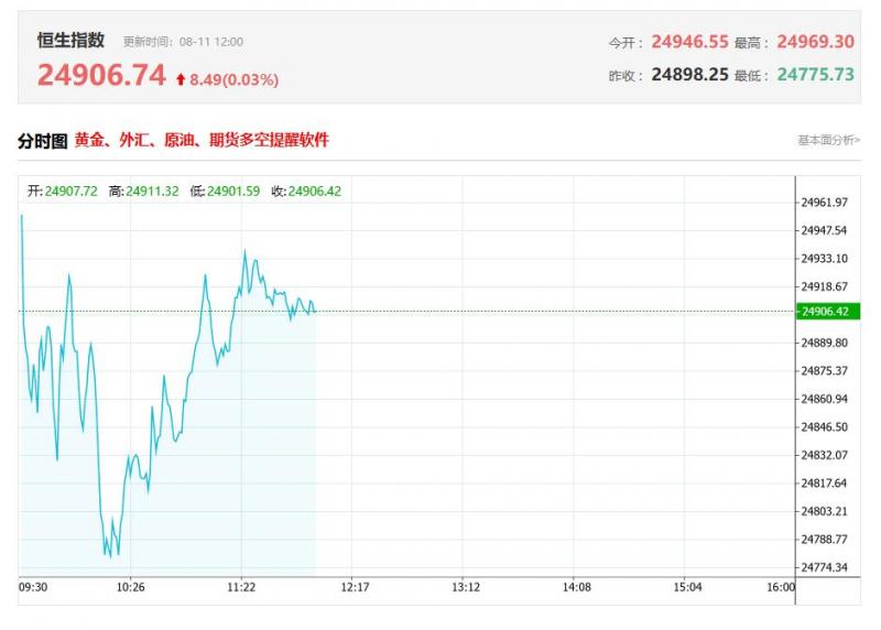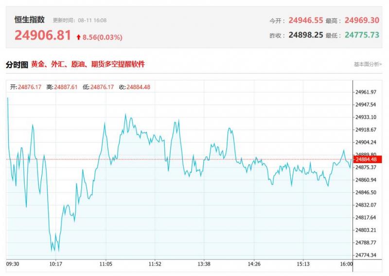 港股收盘行情: 香港恒生指数8月11日(周一)收盘上涨47.99点,涨幅0.19%,报24906.81点; 香港恒生科技指数8月11日(周一)收盘下跌0.28点,跌幅0.01%,报5460.02点; 国企指数8月11日(周一)收盘下跌7.2点,跌幅0.08%,报8888.08点; 红筹指数8月11日(周一)收盘上涨10.8点,涨幅0.25%