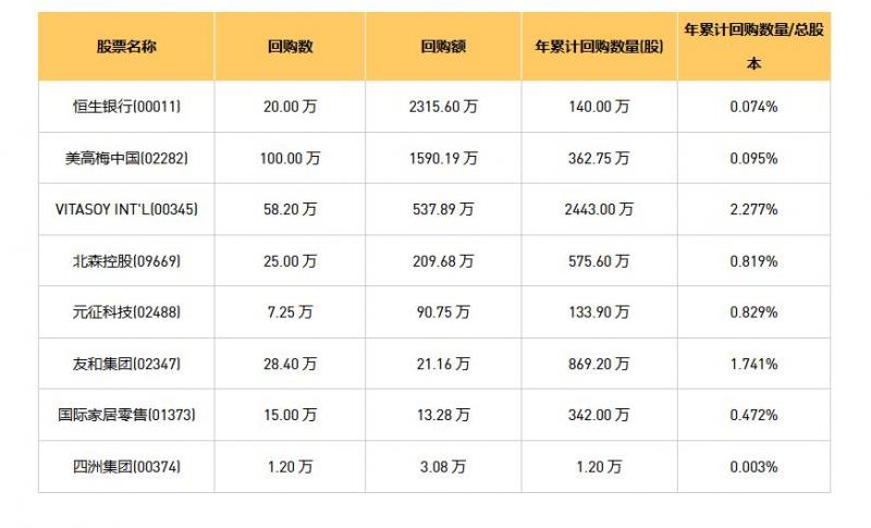 08月12日港股回购概况: VITAOYINT'L(00345)、元征科技(02488)、友和集团(02347)、四洲集团(00374)、恒生银行(00011)、美高梅中国(02282)、国际家居零售(01373)、北森控股(09669)于2025年8月11日进行了回购。其中,回购金额最大的为恒生银行(00011),回购数量20.00万,回购金额2315.60万元。