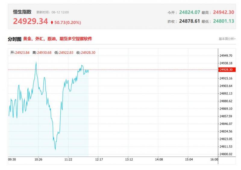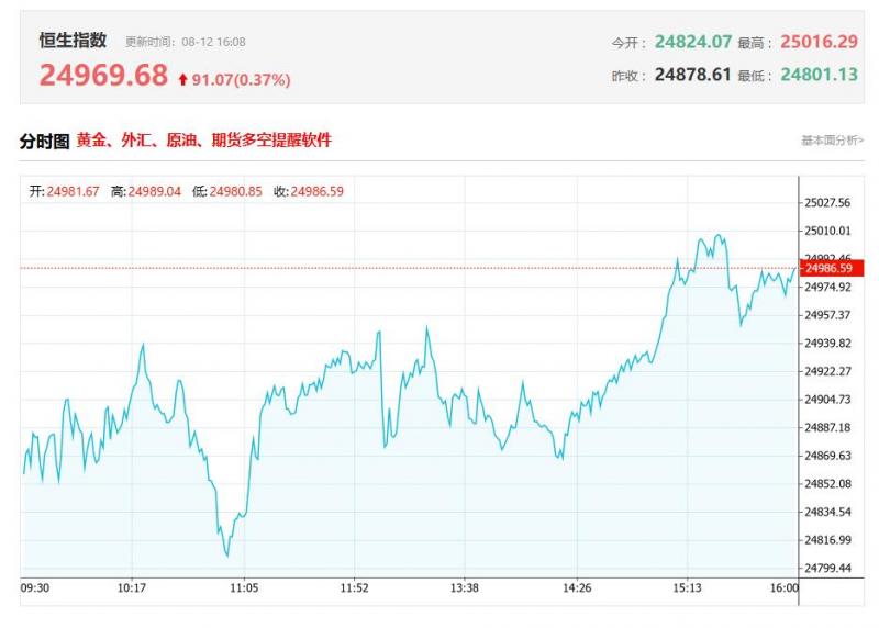 港股收盘行情: 香港恒生指数8月12日(周二)收盘上涨62.87点,涨幅0.25%,报24969.68点; 香港恒生科技指数8月12日(周二)收盘下跌20.86点,跌幅0.38%,报5439.16点; 国企指数8月12日(周二)收盘上涨28.77点,涨幅0.32%,报8916.85点; 红筹指数8月12日(周二)收盘上涨56.89点,涨幅1.