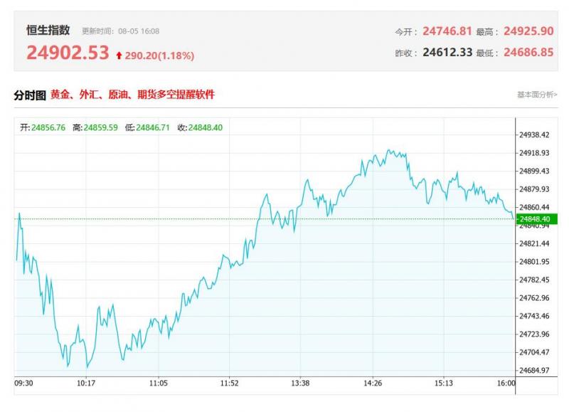 港股收盘行情: 香港恒生指数8月5日(周二)收盘上涨169.08点,涨幅0.68%,报24902.53点; 香港恒生科技指数8月5日(周二)收盘上涨39.82点,涨幅0.73%,报5521.07点; 国企指数8月5日(周二)收盘上涨57.59点,涨幅0.65%,报8951.07点; 红筹指数8月5日(周二)收盘上涨22.19点,