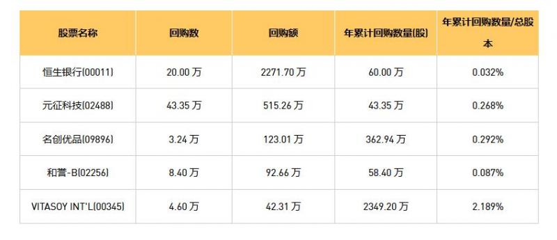 08月06日港股回购概况: VITAOYINT'L(00345)、名创优品(09896)、元征科技(02488)、恒生银行(00011)、和誉-B(02256)于2025年8月5日进行了回购。其中,回购金额最大的为恒生银行(00011),回购数量20.00万,回购金额2271.70万元。 (亚汇网编辑:书瑶)
