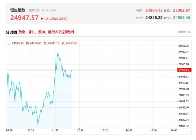 上午盘面: 临近午盘港股三大指数短线拉升集体转涨,恒生指数涨涨0.18%盘中重回25000点,国企指数微跌0.03%,恒生科技指数微涨0.03%。盘面上,大型科技股涨跌各异,其中,阿里巴巴、腾讯涨近2%,京东飘红,美团、网易、百度跌超1%;“反内卷”相关板块涨幅抢眼,涨价潮叠加反内卷,纸业股持续上攻,玖龙纸业大