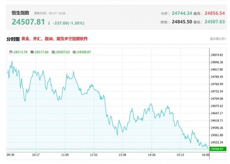 港股收盘行情: 香港恒生指数8月1日(周五)收盘下跌265.52点,跌幅1.07%,报24507.81点; 香港恒生科技指数8月1日(周五)收盘下跌55.74点,跌幅1.02%,报5397.4点; 国企指数8月1日(周五)收盘下跌78.53点,跌幅0.88%,报8804.42点; 红筹指数8月1日(周五)收盘下跌48.69点,跌幅1.15%