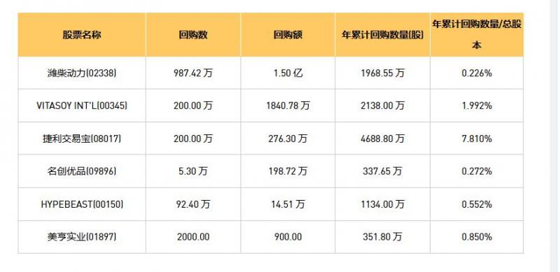 08月01日港股回购概况: VITAOYINT'L(00345)、捷利交易宝(08017)、名创优品(09896)、美亨实业(01897)、HYBAT(00150)、潍柴动力(02338)于2025年7月31日进行了回购。其中,回购金额最大的为潍柴动力(02338),回购数量987.42万,回购金额1.50亿元。 (亚汇网编辑:书瑶)