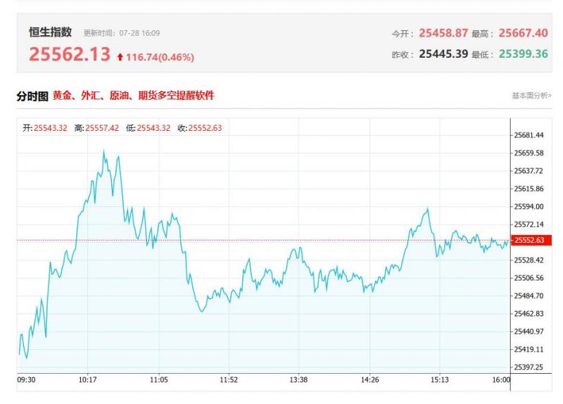 港股收盘行情: 香港恒生指数7月28日(周一)收盘上涨173.78点,涨幅0.68%,报25562.13点; 香港恒生科技指数7月28日(周一)收盘下跌13.88点,跌幅0.24%,报5664.02点; 国企指数7月28日(周一)收盘上涨26.66点,涨幅0.29%,报9177.15点; 红筹指数7月28日(周一)收盘上涨5.69点,涨幅0.