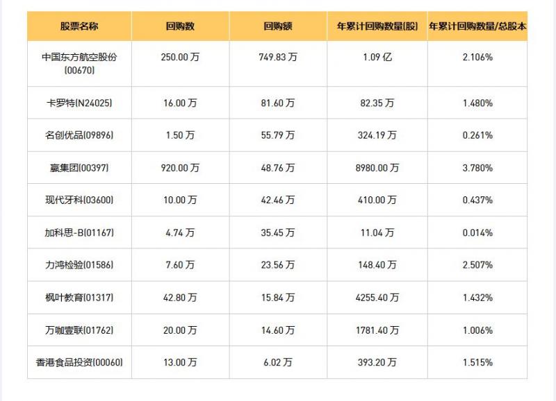 07月29日港股回购概况: 名创优品(09896)、嬴集团(00397)、万咖壹联(01762)、力鸿检验(01586)、枫叶教育(01317)、卡罗特(N24025)、香港食品投资(00060)、中国东方航空股份(00670)、现代牙科(03600)、加科思-B(01167)于2025年7月28日进行了回购。其中,回购金额最大的为中国东方航空股份(0