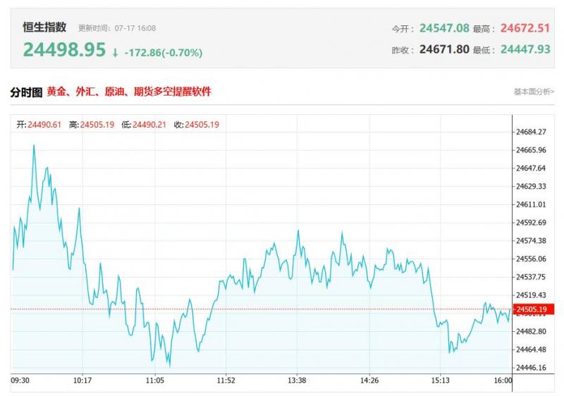 港股收盘行情: 香港恒生指数7月17日(周四)收盘下跌18.81点,跌幅0.08%,报24498.95点; 香港恒生科技指数7月17日(周四)收盘上涨30.45点,涨幅0.56%,报5448.85点; 国企指数7月17日(周四)收盘下跌8.29点,跌幅0.09%,报8853.1点; 红筹指数7月17日(周四)收盘下跌26.75点,