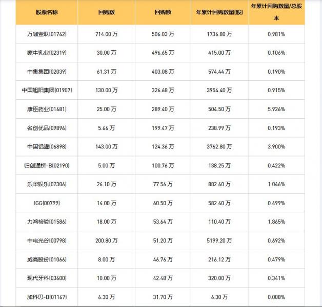 07月16日港股回购概况: 力鸿检验(01586)、蒙牛乳业(02319)、威高股份(01066)、中集集团(02039)、中国铝罐(06898)、万咖壹联(01762)、世界华文媒体(00685)、IGG(00799)、天福(06868)、现代牙科(03600)、归创通桥-B(02190)、名创优品(09896)、康臣药业(01681)、旭日企业(00393)、中电