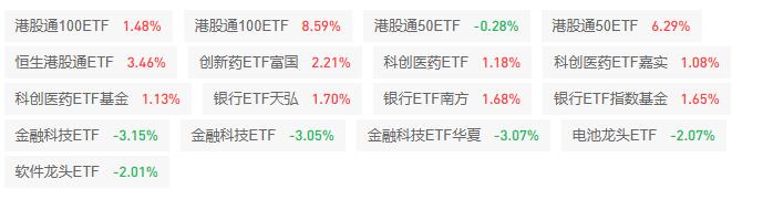 上午盘面: 港股今日休市,资金爆炒“迷你规模”港股通TF,易方达基金港股通100TF、国泰基金港股通50TF和银华基金恒生港股通TF分别涨8.59%、6.29%、3.46%,最新溢折率分别为10.62%、7.6%和4.74%。创新药板块表现强势,创新药TF富国、工银瑞信基金科创医药TF和华夏基金科创医药TF基金分别涨2.21%、1.18%、1.13%