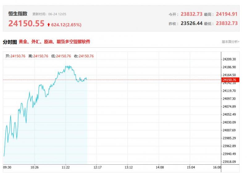 上午盘面: 伊朗和以色列宣布正式停火,金融风险市场情绪修复。港股上午盘三大指数呈现高开高走行情,盘中均大涨超2%。截止午盘,恒生指数、国企指数分别上涨1.95%及1.92%,恒指重回24000点上方,恒生科技指数涨2.28%。盘面上,作为市场风向标的大型科技股集体拉升,其中,小米涨近4%,网易、快手、阿里巴巴涨