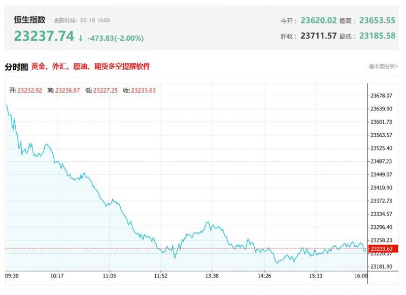 港股收盘行情: 香港恒生指数6月19日(周四)收盘下跌472.95点,跌幅1.99%,报23237.74点; 香港恒生科技指数6月19日(周四)收盘下跌126.09点,跌幅2.42%,报5088.32点; 国企指数6月19日(周四)收盘下跌183.25点,跌幅2.13%,报8410.94点; 红筹指数6月19日(周四)收盘下跌83.2