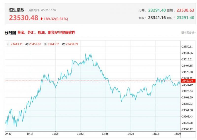 港股收盘行情: 香港恒生指数6月20日(周五)收盘上涨292.74点,涨幅1.26%,报23530.48点; 香港恒生科技指数6月20日(周五)收盘上涨44.82点,涨幅0.88%,报5133.14点; 国企指数6月20日(周五)收盘上涨116.13点,涨幅1.38%,报8527.07点; 红筹指数6月20日(周五)收盘上涨16.16点,涨幅