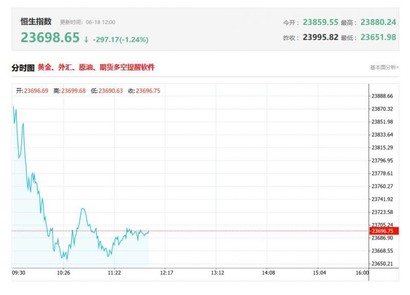 上午盘面: 中东紧张局势持续,风险市场明显承压。港股上午盘三大指数低开低走均跌超1%,恒生科技指数跌幅最大,午间收跌1.58%,恒生指数、国企指数分别下跌1.17%及1.18%。盘面上,大型科技股、大金融股(尤其是券商股)、中字头股等权重普遍下跌大市承压明显,其中,美团跌3.7%,阿里巴巴、腾讯走低,中国银河、
