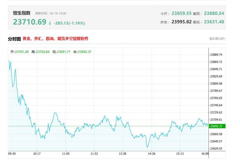 港股收盘行情: 香港恒生指数6月18日(周三)收盘下跌269.61点,跌幅1.12%,报23710.69点; 香港恒生科技指数6月18日(周三)收盘下跌77.44点,跌幅1.46%,报5214.41点; 国企指数6月18日(周三)收盘下跌100.48点,跌幅1.16%,报8594.19点; 红筹指数6月18日(周三)收盘下跌36.17点,跌幅