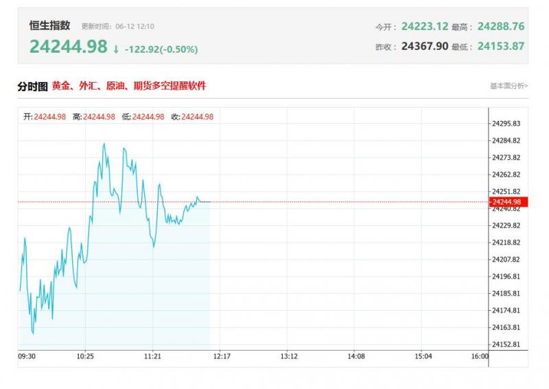 上午盘面: 中东地缘局势急剧升温,港A两地市场普遍下跌。截止午盘,恒生科技指数大幅收跌2.08%,恒生指数、国企指数分别下跌0.7%及0.89%,恒指失守24000点关口,市场情绪偏弱。盘面上,大型科技股全线下跌大市承压,美团跌近3%,阿里巴巴、小米跌1.7%,快手、京东、网易、腾讯均走低;特朗普称可能会提高汽车