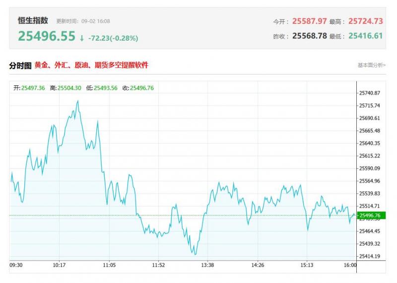 港股收盘行情: 香港恒生指数9月2日(周二)收盘下跌120.87点,跌幅0.47%,报25496.55点; 香港恒生科技指数9月2日(周二)收盘下跌70.5点,跌幅1.22%,报5728.46点; 国企指数9月2日(周二)收盘下跌13.75点,跌幅0.15%,报9108.12点; 红筹指数9月2日(周二)收盘下跌44.72点,跌
