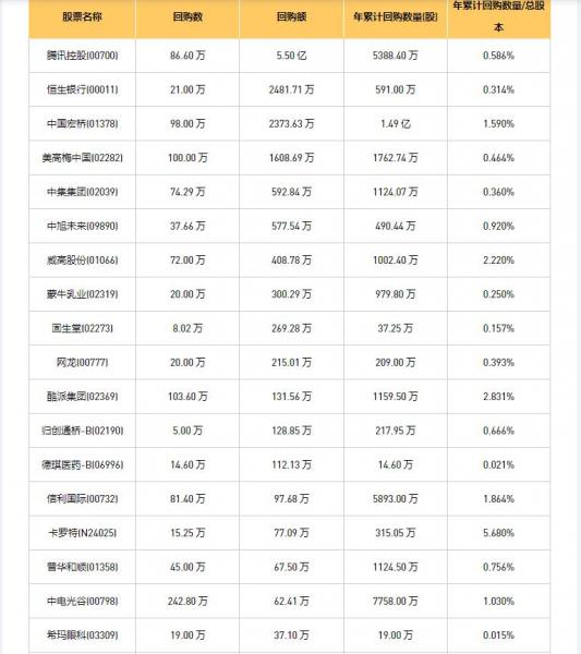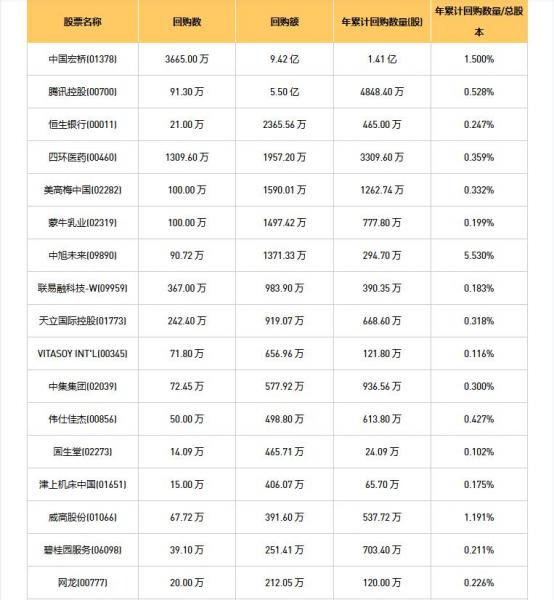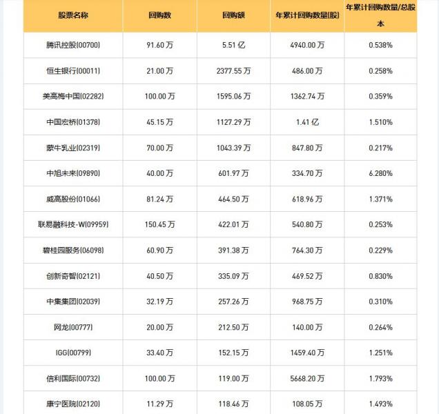 09月03日港股回购概况: 伟仕佳杰(00856)、永安国际(00289)、VITAOYINT'L(00345)、威高股份(01066)、网龙(00777)、首佳科技(00103)、津上机床中国(01651)、百宏实业(02299)、清科创业(01945)、万咖壹联(01762)、信利国际(00732)、四环医药(00460)、碧桂园服务(06098)、旭日企业(00393