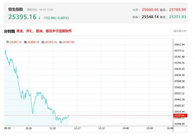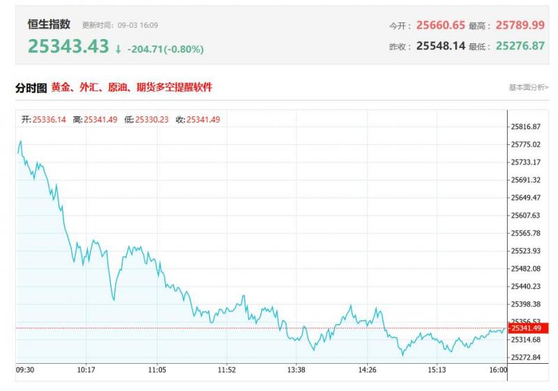 港股收盘行情: 香港恒生指数9月3日(周三)收盘下跌153.12点,跌幅0.6%,报25343.43点; 香港恒生科技指数9月3日(周三)收盘下跌44.72点,跌幅0.78%,报5683.74点; 国企指数9月3日(周三)收盘下跌58.1点,跌幅0.64%,报9050.02点; 红筹指数9月3日(周三)收盘下跌17.94点,跌幅0.42%,