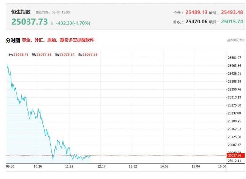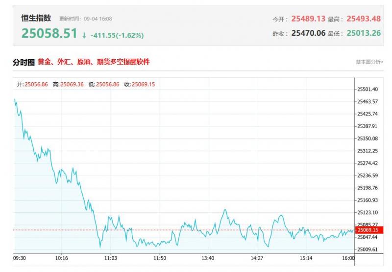 港股收盘行情: 香港恒生指数9月4日(周四)收盘下跌284.92点,跌幅1.12%,报25058.51点; 香港恒生科技指数9月4日(周四)收盘下跌104.88点,跌幅1.85%,报5578.86点; 国企指数9月4日(周四)收盘下跌112.93点,跌幅1.25%,报8937.09点; 红筹指数9月4日(周四)收盘下跌29.58点