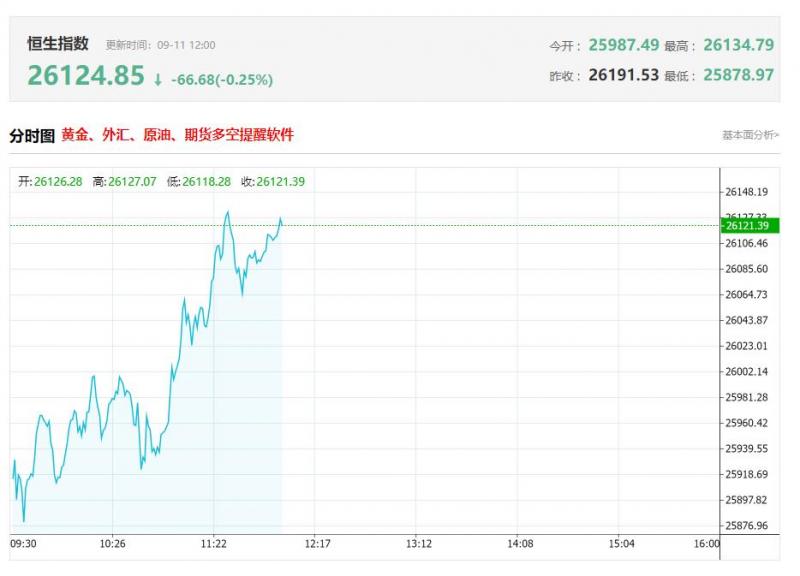 上午盘面: 港股上午盘三大指数高开低走,截止午盘,恒生指数跌0.4%,国企指数跌0.53%,恒生科技指数跌0.54%,市场情绪持续谨慎。盘面上,盘初集体上涨的大型科技股部分转跌,其中,美团、小米跌超1%,阿里巴巴、腾讯小幅下跌,百度涨2.68%,京东涨超1%,快手飘红;生物医药股表现活跃,互联网医疗股、创新药方