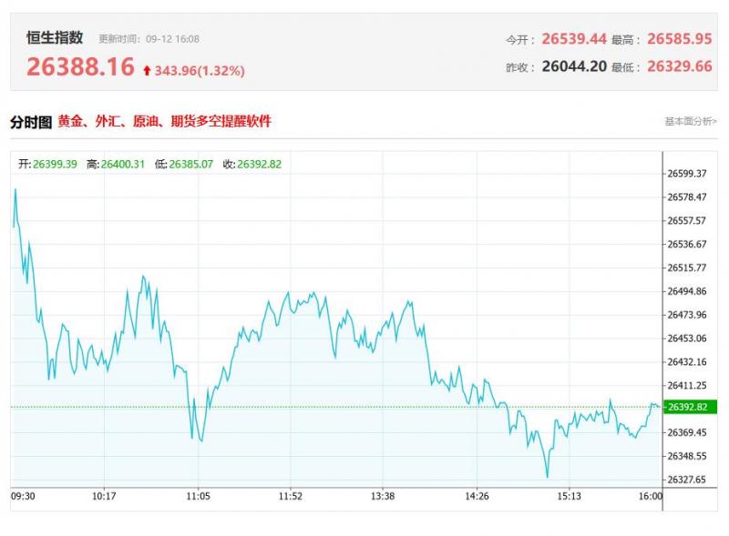 港股收盘行情: 香港恒生指数9月12日(周五)收盘上涨301.84点,涨幅1.16%,报26388.16点; 香港恒生科技指数9月12日(周五)收盘上涨100.5点,涨幅1.71%,报5989.27点; 国企指数9月12日(周五)收盘上涨104.69点,涨幅1.13%,报9364.94点; 红筹指数9月12日(周五)收盘上涨18.3点,涨幅0