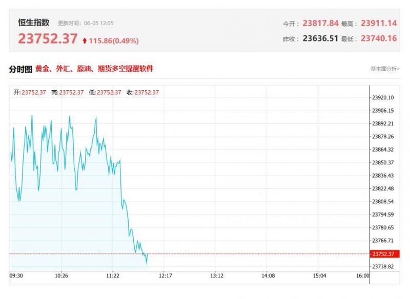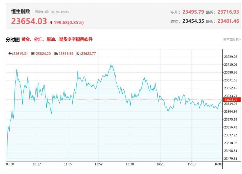 港股收盘行情: 香港恒生指数6月4日(周三)收盘上涨141.54点,涨幅0.6%,报23654.03点; 香港恒生科技指数6月4日(周三)收盘上涨29.53点,涨幅0.57%,报5219.02点; 国企指数6月4日(周三)收盘上涨56.89点,涨幅0.67%,报8576.75点; 红筹指数6月4日(周三)收盘上涨8.93点,涨