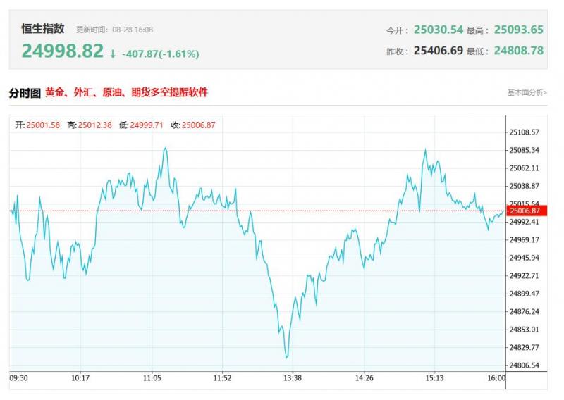 港股收盘行情: 香港恒生指数8月28日(周四)收盘下跌202.94点,跌幅0.81%,报24998.82点; 香港恒生科技指数8月28日(周四)收盘下跌53.51点,跌幅0.94%,报5644.02点; 国企指数8月28日(周四)收盘下跌103.33点,跌幅1.15%,报8916.93点; 红筹指数8月28日(周四)收盘上涨15.06