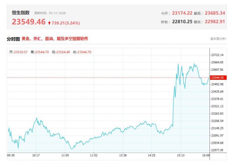 港股收盘行情: 香港恒生指数5月12日(周一)收盘上涨681.72点,涨幅2.98%,报23549.46点; 香港恒生科技指数5月12日(周一)收盘上涨267.1点,涨幅5.16%,报5447.35点; 国企指数5月12日(周一)收盘上涨250.4点,涨幅3.01%,报8559.23点; 红筹指数5月12日(周一)收盘上涨75.82点,涨幅2