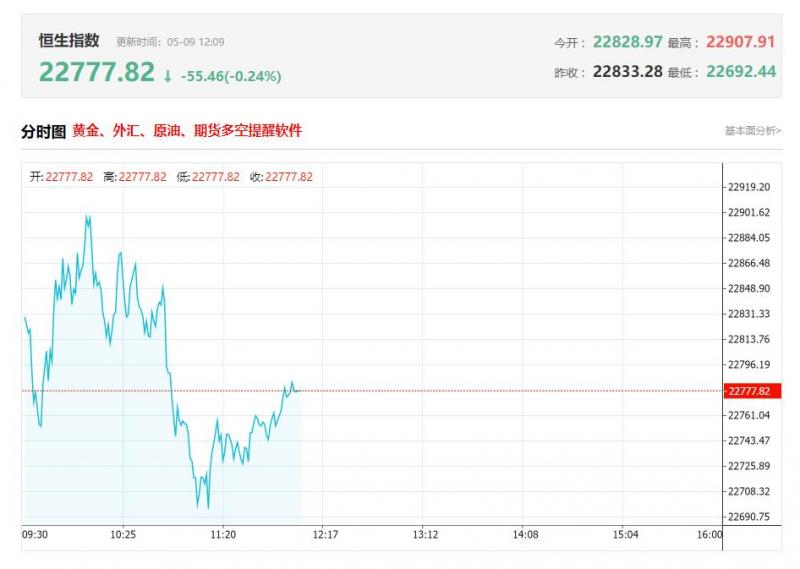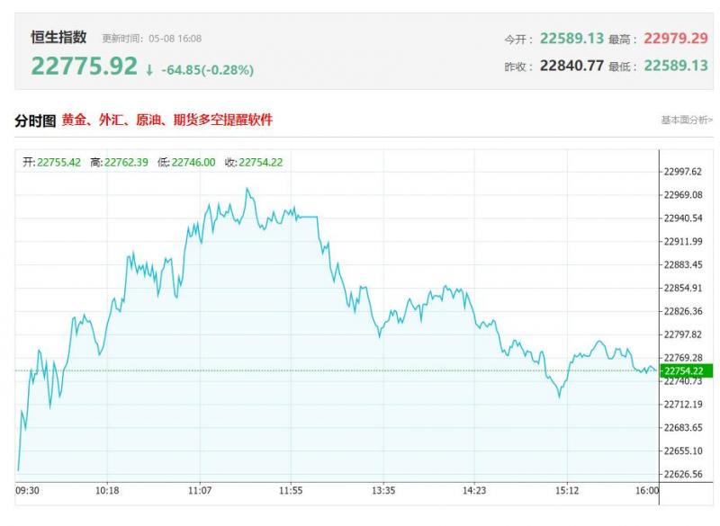 港股收盘行情: 香港恒生指数5月8日(周四)收盘上涨84.04点,涨幅0.37%,报22775.92点; 香港恒生科技指数5月8日(周四)收盘上涨28.87点,涨幅0.56%,报5228.91点; 国企指数5月8日(周四)收盘上涨58.0点,涨幅0.7%,报8300.25点; 红筹指数5月8日(周四)收盘上涨1.97点,涨幅0