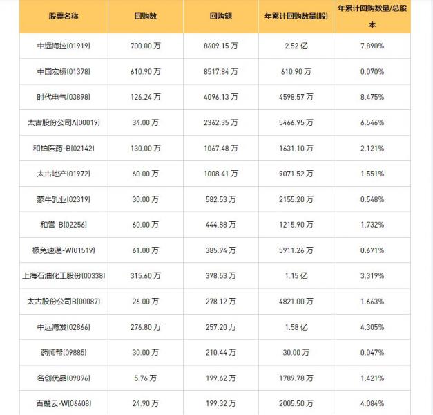 05月08日港股回购概况: 雅生活服务(03319)、信利国际(00732)、上海石油化工股份(00338)、时代电气(03898)、摩比发展(00947)、力鸿检验(01586)、澳优(01717)、百宏实业(02299)、归创通桥-B(02190)、清科创业(01945)、亚洲金融(00662)、威高股份(01066)、中远海发(02866)、名创优品(