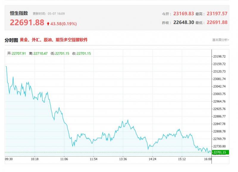 港股收盘行情: 香港恒生指数5月7日(周三)收盘上涨29.17点,涨幅0.13%,报22691.88点; 香港恒生科技指数5月7日(周三)收盘下跌39.46点,跌幅0.75%,报5200.04点; 国企指数5月7日(周三)收盘下跌19.36点,跌幅0.23%,报8242.25点; 红筹指数5月7日(周三)收盘上涨4.15点,涨幅0.11%,