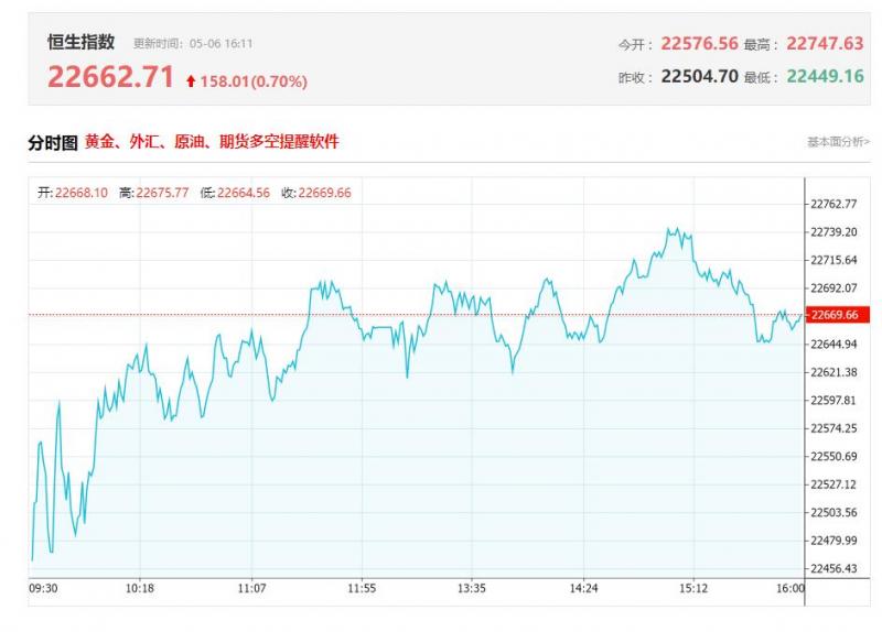 港股收盘行情: 香港恒生指数5月6日(周二)收盘上涨158.03点,涨幅0.7%,报22662.71点; 香港恒生科技指数5月6日(周二)收盘下跌4.56点,跌幅0.09%,报5239.5点; 国企指数5月6日(周二)收盘上涨30.57点,涨幅0.37%,报8261.61点; 红筹指数5月6日(周二)收盘上涨0.46点,涨幅0.01%,报