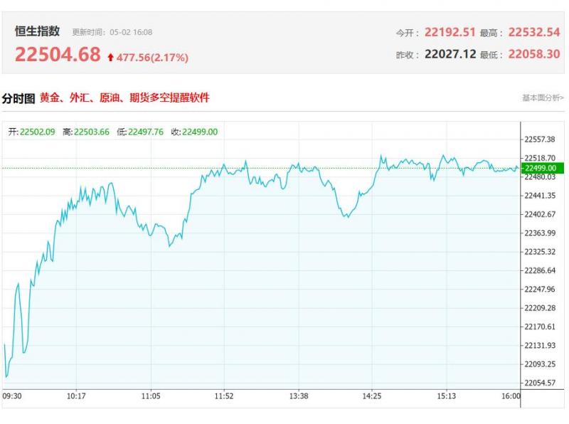 港股收盘行情: 香港恒生指数5月2日(周五)收盘上涨385.27点,涨幅1.74%,报22504.68点; 香港恒生科技指数5月2日(周五)收盘上涨156.64点,涨幅3.08%,报5244.06点; 国企指数5月2日(周五)收盘上涨154.78点,涨幅1.92%,报8231.04点; 红筹指数5月2日(周五)收盘上涨17.62点
