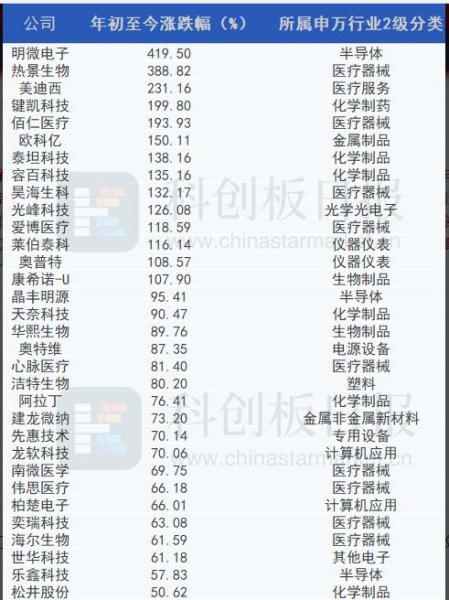今年年初至6月30日收盘, 剔除今年上市的次新股,科创板共106家公司股价收涨,109家公司股价收跌。明微电子、热景生物、美迪西位列涨幅榜Top3,分别涨419.5%、388.82%、231.16%。具体来看,区间涨幅超一倍的公司有14家,其中医疗器械类公司数量最多,分别为热景生物、佰仁医疗、昊海生科、爱博医疗,区间涨幅在50%-100%(不含50%)的公司共18家,医疗器械类公司高达5家,化学制品、半导体、计算机应用领域也有多支个股入列。