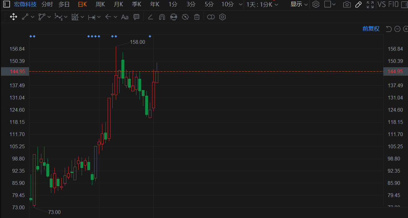 次新股宏微科技(688711.SH)再度拉升涨超4%,3日连涨近20%。报145元有望冲击历史高价,总市值142亿元。