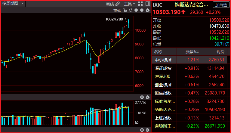 周五,美国股市三大指数涨跌互现,截止收盘,道指跌0.23%,标普500指数涨0.28%,纳斯达克指数涨0.28%。