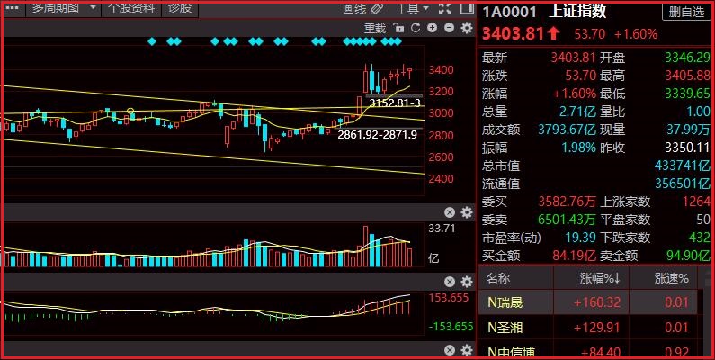 3.上证指数本周先跌后涨,周线周期收上吊阳线,各周期均线多头发散,成交量较上周小幅缩量,日线周期强势上行,收小阳线,中短周期均线多头排列发散,成交量小幅放量,创业板指数周线收小阳线,中短周期均线多头排列,成交量小幅放量,内部的大5浪结构清晰,日线周期收小阳线,均线多头走平后开始翘头向上,成交量小幅缩量,本周沪深两市,从运行的动能来看,进行浪级反上涨,大小周期内部结构清晰。