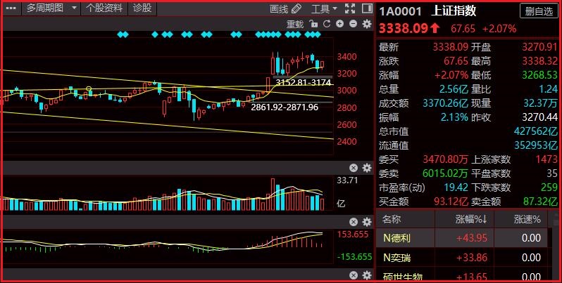 3.周五A股大盘收出高开的放量大阳,中期夹板状态,短线是多头强势。创指收出高开的缩量大阳,中期夹板状态,短线是多头占优。在券商保险的发力带动下开始攻击本周的阻力区3310-3330,完全封闭了3316的缺口,不仅站上了日级别生命线还冲上了60日线,攻击力度大、成交量也放出来了。午后的暴拉或与富时罗素成分股调整一事有关。因此,是真想走强还是假想走强,下周才能明确真相。后市振荡不失3302将会继续走强。操作上,中期控好仓位,以逢低做多为主;短期仓位高抛低吸为宜。