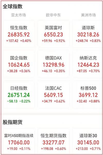 在欧洲各国股市中,德国DAX 30指数收跌0.28%,报收于13298.96点;英国富时100指数收涨2.87%,报收于6550.23点;法国CAC 40指数收涨0.20%,报收于5609.15点。与此同时,意大利富时MIB指数收跌0.78%,报收于22178.80点。