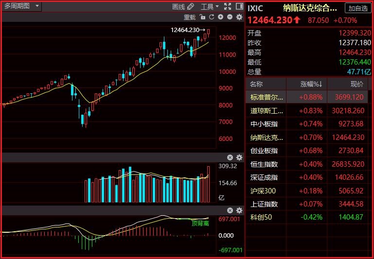 美东时间周五,美股三大指数集体收涨,齐创历史新高,截止收盘,道指报30218.26点,涨248.74点,涨幅0.83%;纳指报12464.23点,涨87.05点,涨幅0.70%;标普500指数报3699.12点,涨32.40点,涨幅0.88%。