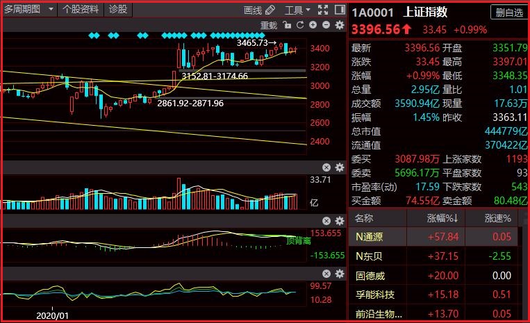 本周A股三阳两阴走势,周涨幅0.07%;截止周五收盘:沪指报3396.56点,上涨33.45点,涨幅0.99%;盘中最高3397.01点,最低3348.35点,成交量3590.94亿。行业板块方面,电力、有色加工、稀缺资源、HIT电池、天然气等板块涨幅居前,白酒、养殖业、农业种植、食品加工、中船系等板块跌幅居前,创业板指涨逾0.71%,两市涨停家数增多,个股大面积超跌反弹。