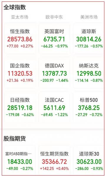 在欧洲各国股市中,德国DAX 30指数收跌1.86%,报收于13787.3点;英国富时100指数收跌2.00%,报收于6735.71点;法国CAC 40指数收跌1.67%,报收于5611.69点。与此同时,意大利富时MIB指数收跌1.81%,报收于22381.35点。