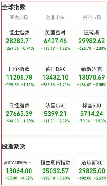 在欧洲各国股市中,德国DAX 30指数收跌3.18%,报收于13432.10点;英国富时100指数收跌4.30%,报收于6407.46点;法国CAC 40指数收跌2.88%,报收于5399.21点。与此同时,意大利富时MIB指数收跌2.34%,报收于21572.53点。