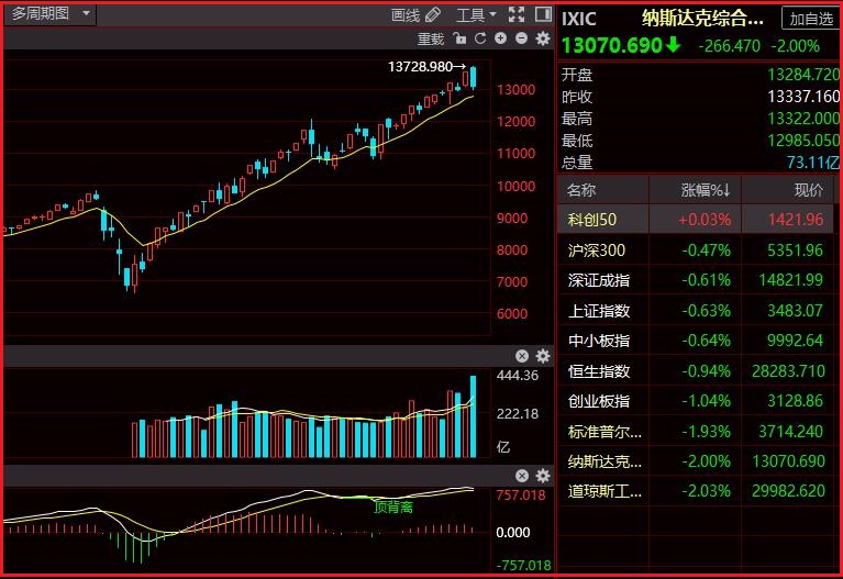美东时间周五,美股三大指数集体收跌,道指跌超2%、失守30000点大关,银行、航空、芯片及大型科技股普遍下跌。截止收盘,道指跌620.74点,报29982.62点,跌幅2.03%;纳指跌266.46点,报13070.70点,跌幅2.00%;标普500指数跌73.14点,报3714.24点,跌幅1.93%。
