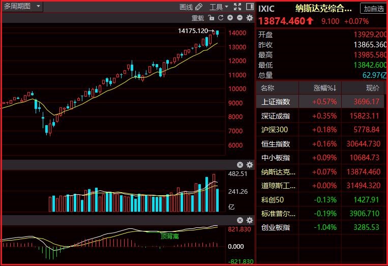 3.周MACD指标显示顶背离状态,RSI显示多头状态,周线收一假阴线。